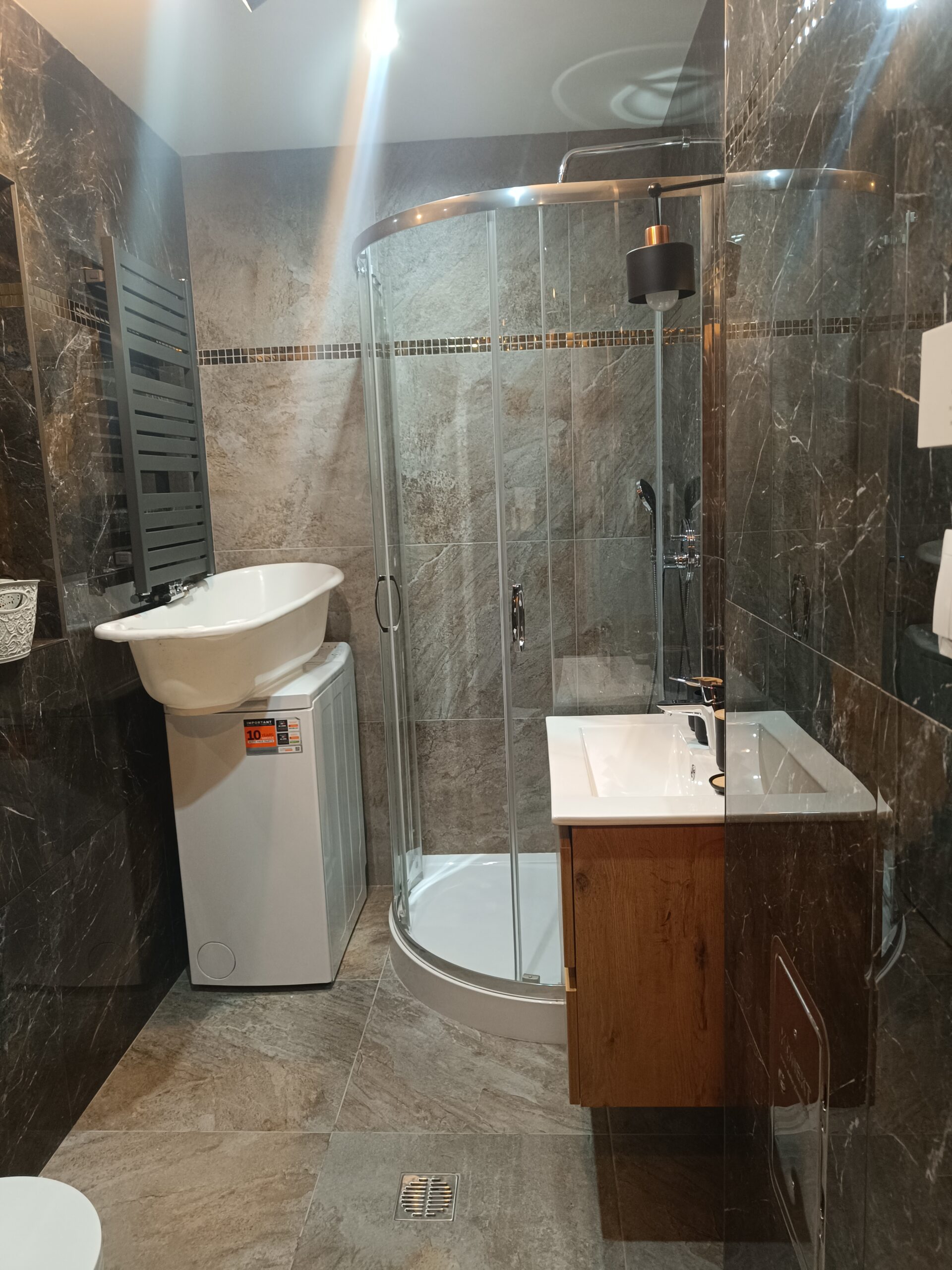 Każdy domek posiada dwie komfortowe łazienki wyposażone w prysznic. Stylowe wykończenie i wygodne udogodnienia zapewniają pełen relaks po dniu spędzonym w górach.